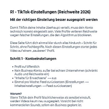 Du bekommst ein Setup, das 2026 funktioniert: Reichweite-Modul, Posting-Regeln, SEO-Captions, B-Roll, Voiceovers, Systeme, die Ergebnisse bringen - perfekt für deine Routine.