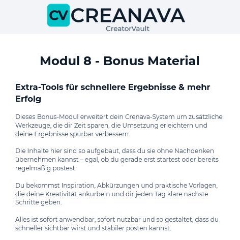 Creanava CreatorVault ist für alle, die endlich systematisch posten wollen - ohne Stress, ohne Ratespiele, ohne Technikfrust.
