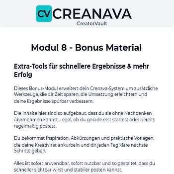 Content zu erstellen darf nicht kompliziert sein. Mit Creanava bekommst du einen klaren Ablauf, sofort einsetzbare Vorlagen und konkrete Schritte, die dir jeden Tag Zeit sparen.